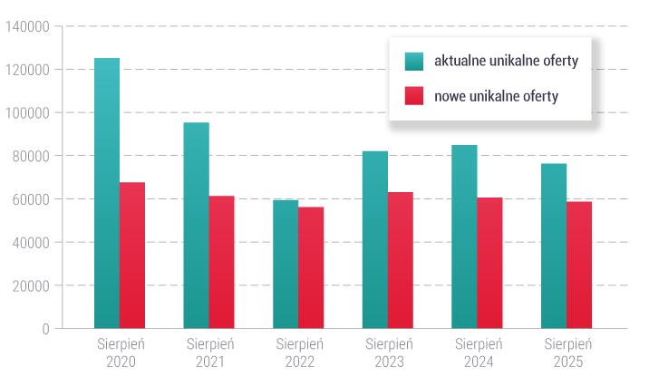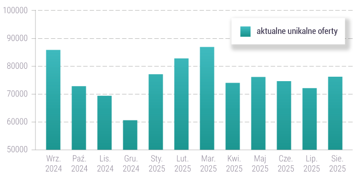 Rynek najmu funkcjonuje zgodnie z sezonowym rytmem — ofert ubywa, ale sytuacja jest daleka od tej z czasów największego kryzysu. Pod sam koniec sierpnia najemcy mogli wybierać spośród 76,5 tysiąca unikalnych ofert mieszkań. To o 10% mniej niż rok wcześniej, ale nadal znacznie więcej niż w 2022 roku, kiedy po wybuchu wojny na Ukrainie rynek przeżywał bezprecedensowy szok popytowy.